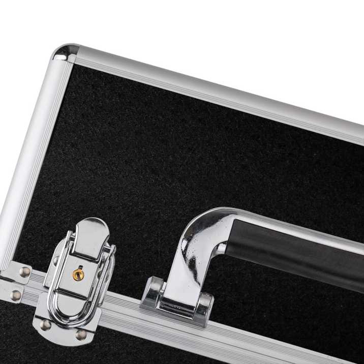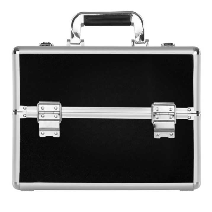 Kuferek otwierany dwustronnie posiada 2 rozsuwane półki na drobne przybory, jak lakiery hybrydowe, pędzle, kosmetyki niewielkich gabarytów i sporych rozmiarów. Dolny schowek, który pomieści większe produkty, np. lampę LED i frezarkę. Bardzo solidnie wykonany ze wzmocnionymi narożnikami i oraz belkami na zewnętrznych rantach, by zagwarantować mu 100% bezpieczeństwa.