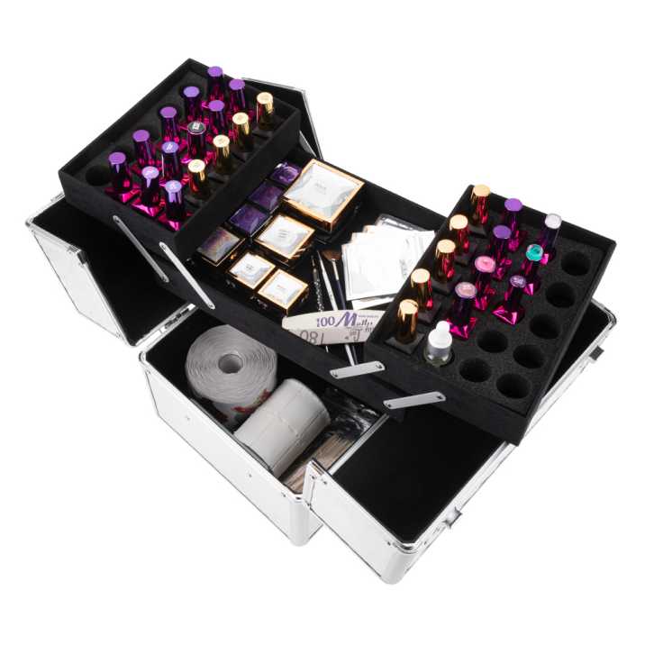 - Poręczny – kuferek łatwy w transporcie, idealny do przechowywania kosmetyków i urządzeń manicure.