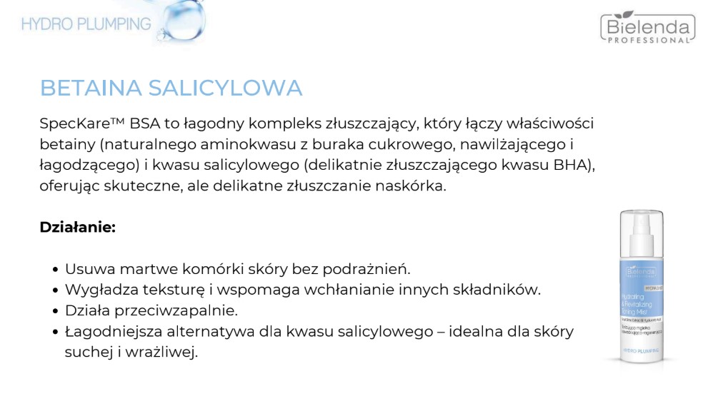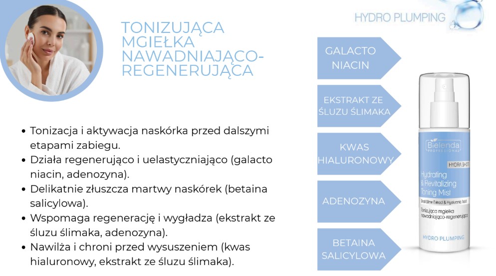 Codzienna pielęgnacja skóry wymaga nie tylko oczyszczenia i nawilżenia, ale także przywrócenia jej naturalnej równowagi pH. Tonizująca Mgiełka Nawadniająco-Regenerująca z linii HYDRO PLUMPING od Bielenda Professional działa wielokierunkowo: koi, nawilża, regeneruje i przygotowuje skórę do dalszych etapów pielęgnacji.