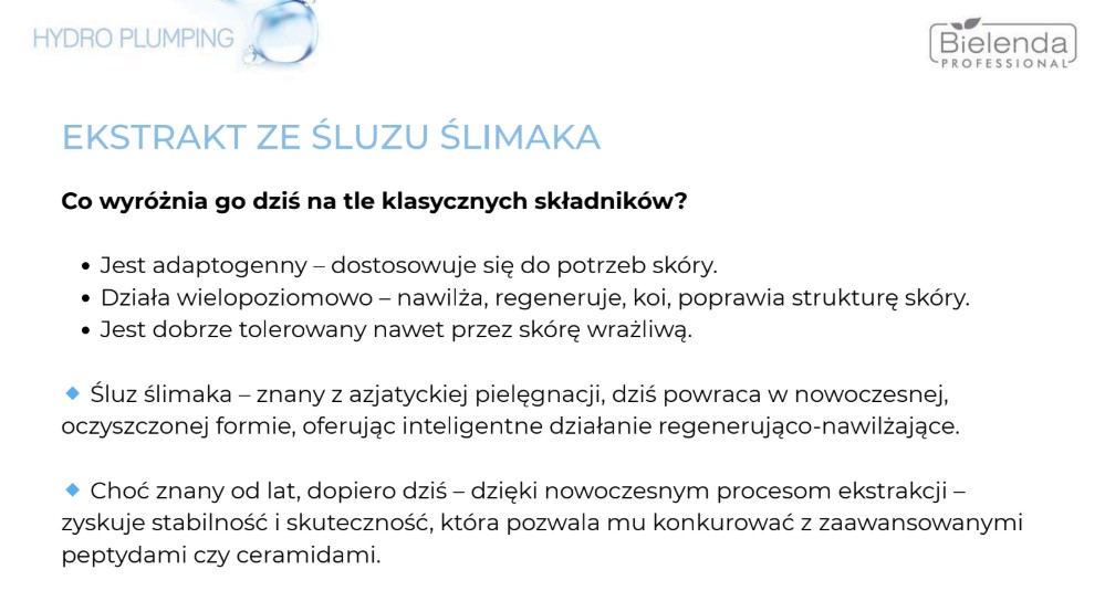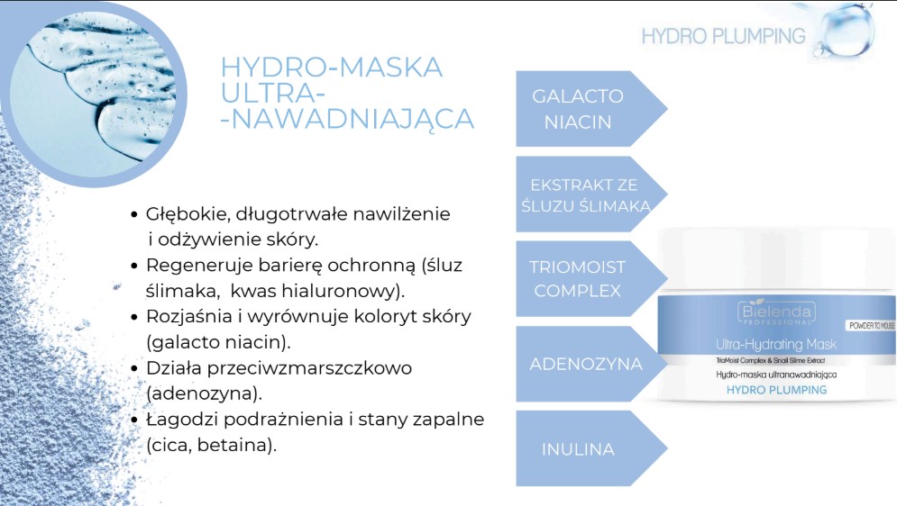 Łączy właściwości nawilżające, nawadniające i odbudowujące barierę hydrolipidową, dzięki czemu skóra staje się sprężysta, promienna i odporna na przesuszenie. Idealna zarówno do profesjonalnych zabiegów kosmetycznych, jak i do pielęgnacji domowej.