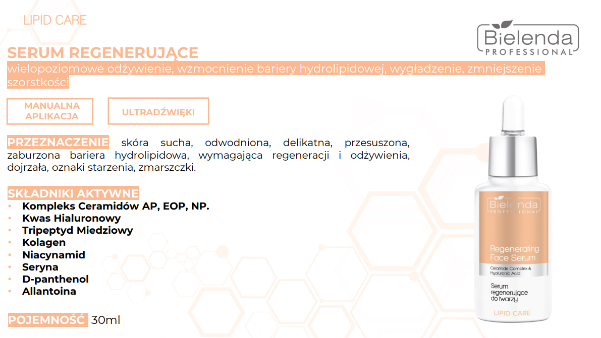 Następnie aplikujemy Regenerujące serum i wmasowujemy. Produkt możemy wprowadzić za pomocą aparatury. Pozostawiamy do wchłonięcia.