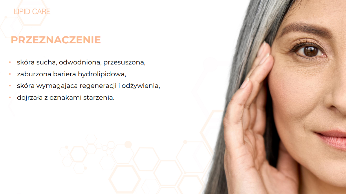 Przeznaczenie: skóra sucha, odwodniona, delikatna, przesuszona, zaburzona bariera hydrolipidowa, wymagająca regeneracji i odżywienia, oznaki starzenia.