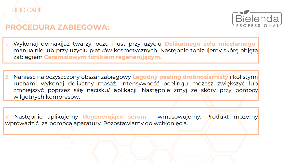 Wykonaj demakijaż twarzy, oczu i ust przy użyciu Delikatnego żelu micelarnego – manualnie lub przy użyciu płatków kosmetycznych. Następnie tonizujemy skórę objętą zabiegiem Ceramidowym tonikiem regenerującym.