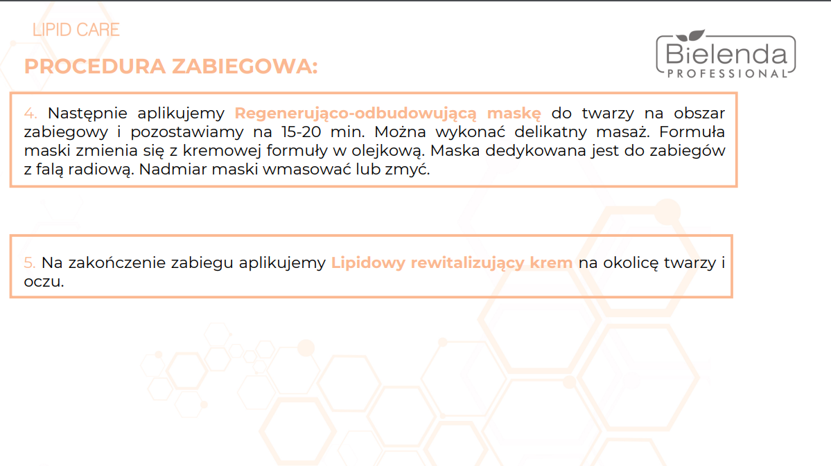 Następnie aplikujemy Regenerująco-odbudowującą maskę do twarzy na obszar zabiegowy i pozostawiamy na 15-20 min. Można wykonać delikatny masaż. Formuła maski zmienia się z kremowej formuły w olejkową. Maska dedykowana jest do zabiegów z falą radiową. Nadmiar maski wmasować lub zmyć.