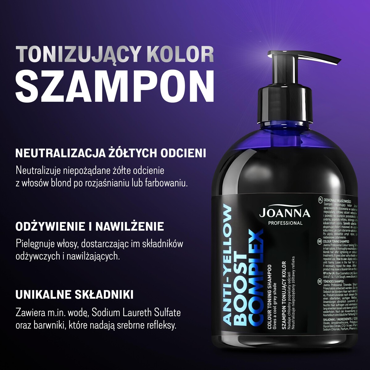 Uzyskaj piękny, chłodny popielaty odcień swojego blondu z szamponem tonującym JOANNA Professional Anti-Yellow Boost Complex.