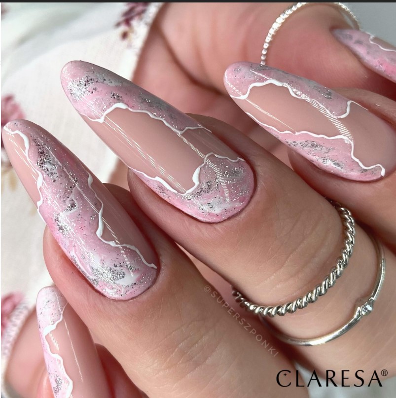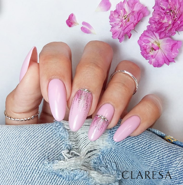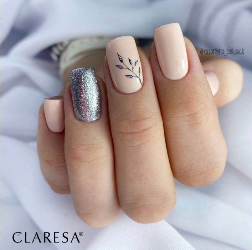 Nałóż cienką warstwę lakieru hybrydowego Full Glitter 1 na wcześniej utwardzoną bazę Claresa. Utwardź w lampie UV/LED. W razie potrzeby powtórz czynność. Zabezpiecz topem hybrydowym Claresa i ponownie utwardź.