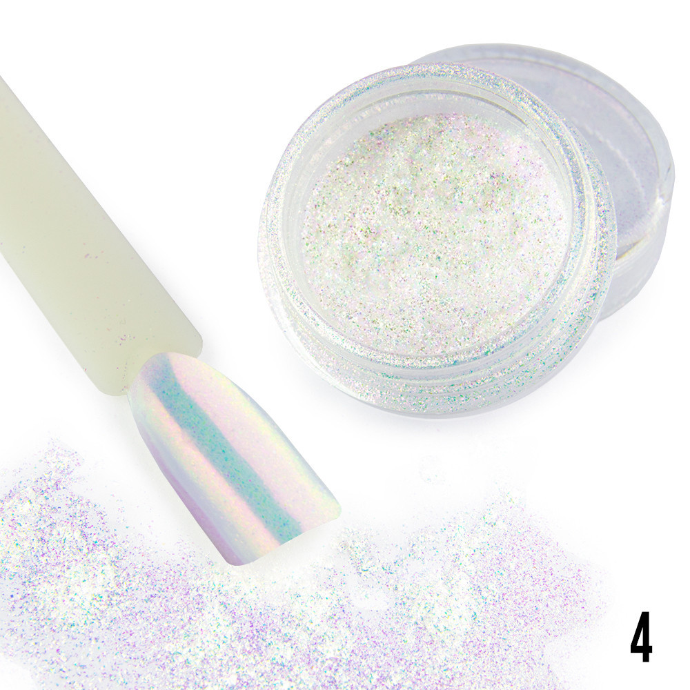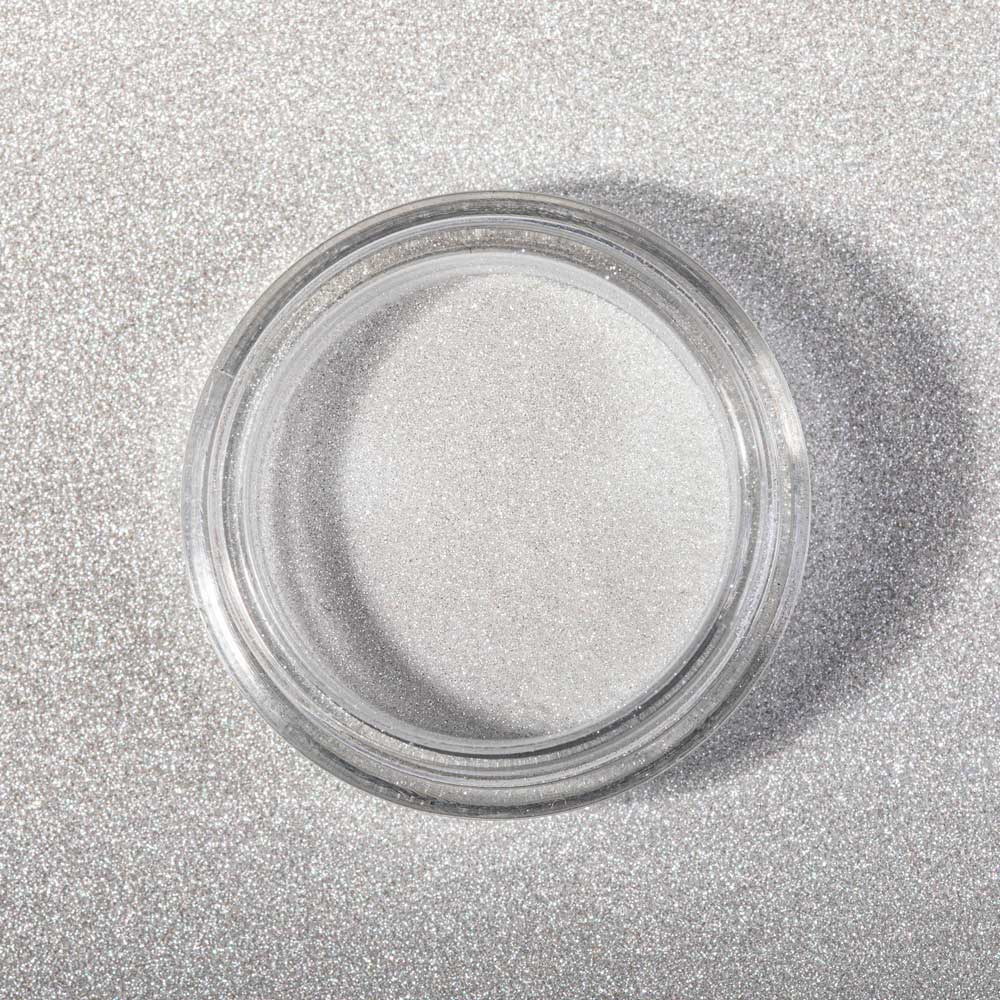 Tworzy na paznokciu taflę z lekko perłowym i lustrzanym efektem, która w zależności od kąta padania światła błyszczy srebrem lub metaliczną bielą. Oglądany w świetle sztucznym dodatkowo zaskakuje mikroskopijnymi brokatowymi punkcikami w odcieniu różu i delikatnego metalicznego pastelowego błękitu.