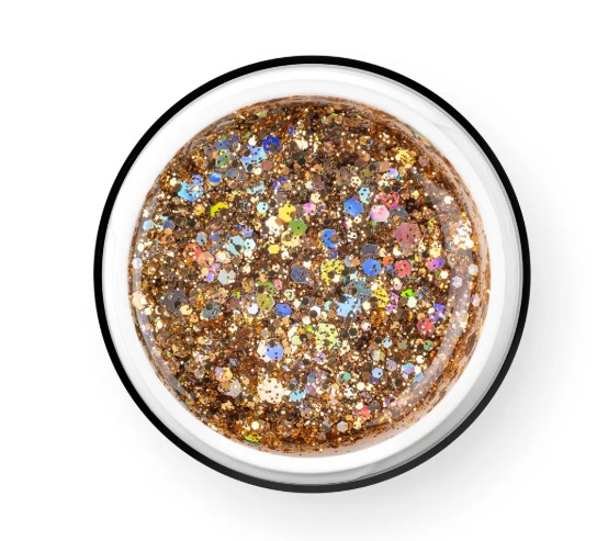 Princess Art Gel Golden Aurora to brokatowy żel do zdobień marki Palu, stworzony z myślą o spektakularnych stylizacjach typu princess nails, fantasy french oraz ombre. Półprzezroczysta baza z dodatkiem złotych i holograficznych drobinek tworzy efekt lśniącej biżuterii na paznokciach. Żel zawiera kolorowe heksagony o różnej wielkości, które pięknie odbijają światło i nadają stylizacji wielowymiarowy, luksusowy charakter.