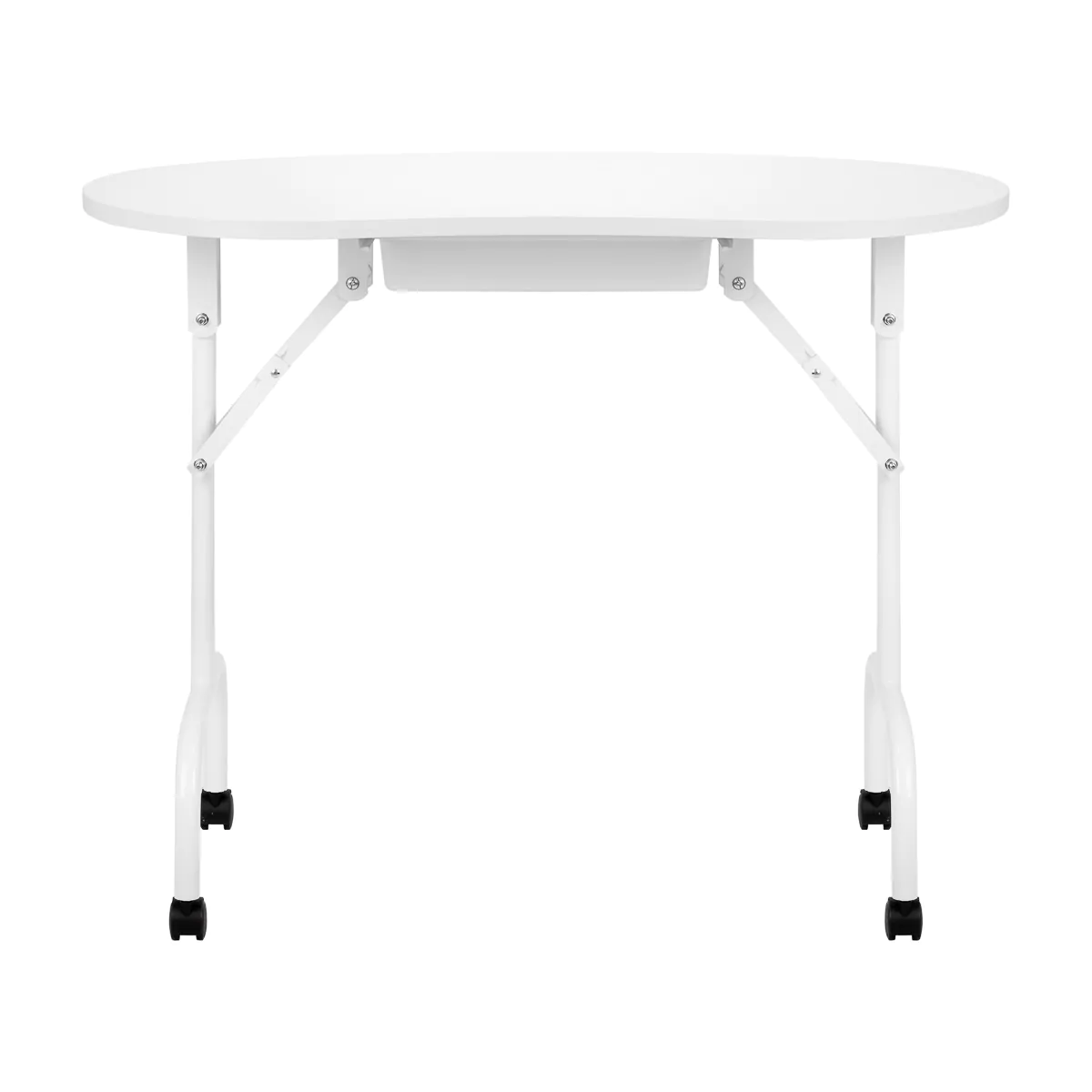 Niewielkie rozmiary złożonego stolika pozwalają na łatwe przechowywanie oraz komfortowy transport mebla, co jest kluczowe w przypadku usług mobilnych. Pod blatem znajduje się miejsce na kuwetę, w której można ułożyć wszelkie najpotrzebniejsze produkty i akcesoria. Taka szufladka zapewnia łatwy dostęp do niezbędnych podczas pracy narzędzi. Poduszka do manicure uefektywnia przeprowadzanie zabiegów, pozwalając klientowi na przyjęcie odpowiedniej, komfortowej pozycji. Biurko jest łatwe do składania, co znacząco wpływa na wygodę użytkowania. Dołączona do zestawu wytrzymała torba świetnie sprawdzi się w trakcie transportu mebla, ułatwiając jego przenoszenie oraz chroniąc przed uszkodzeniami.