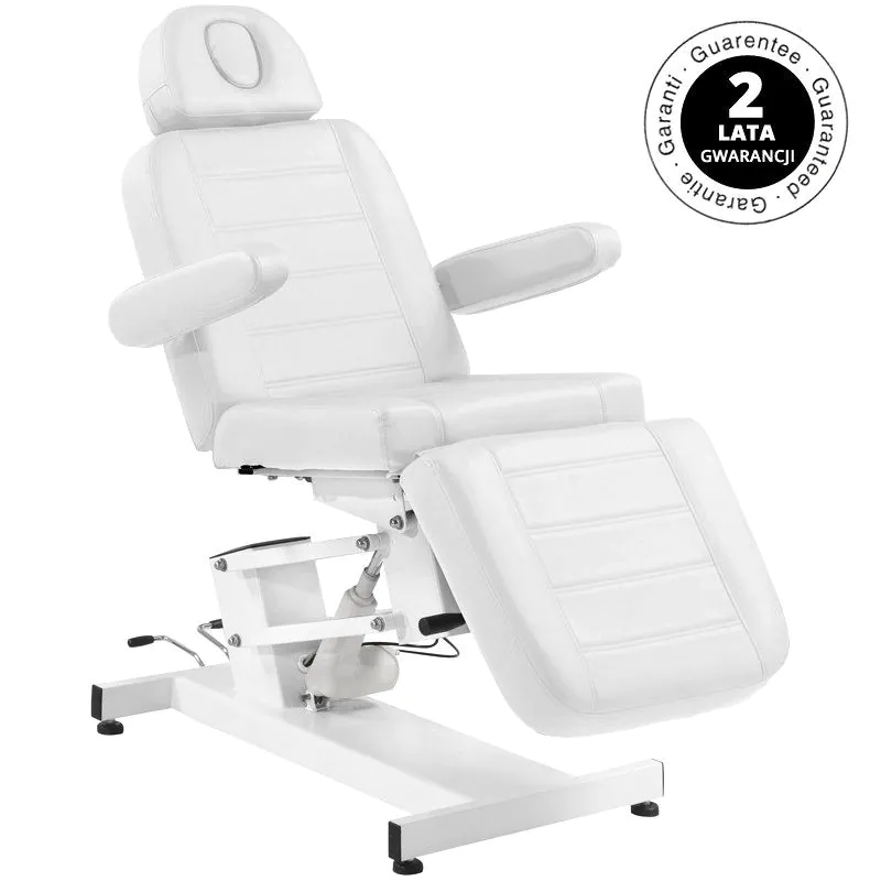 Fotel z otworem w zagłówku, z praktycznymi kuwetami, doskonale sprawdza się w kosmetyce, wizażu. Posiada wyjmowane podłokietniki i zaślepkę w zagłówku. Poszycie fotela łatwo zmywalne, wykonane z eko-skóry, spełniające rygorystyczne wymogi UE, estetyczne, niklowane elementy metalowe. Pod fotelem zamontowany jest pałąk na prześcieradło jednorazowe, serwety lub ręcznik.