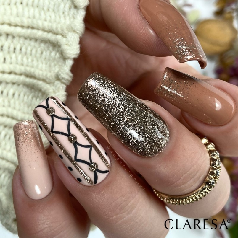 Na utwardzoną bazę hybrydową Claresa nałóż cienką warstwę lakieru Full Glitter 2 i utwardź w lampie UV/LED. W razie potrzeby nałóż drugą warstwę i ponownie utwardź. Stylizację zakończ topem hybrydowym Claresa i utwardź w lampie.