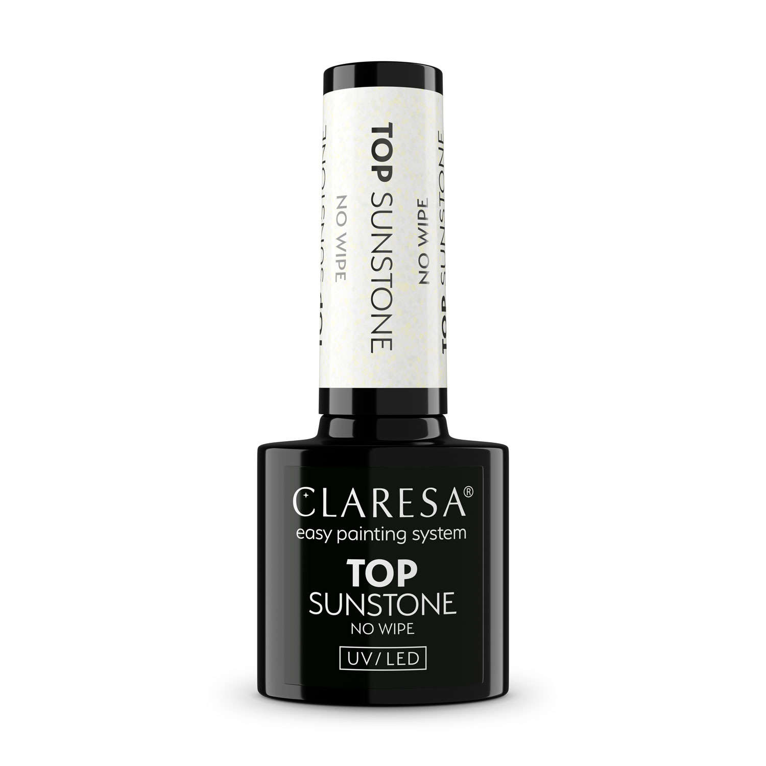 Claresa Top No Wipe Sunstone to transparentny top hybrydowy, który nadaje stylizacji wyjątkowy, ciepły złoty blask. Brokatowa tafla doskonale podkreśla elegancję manicure, tworząc efektowną i luksusową stylizację. Dzięki formule bez warstwy dyspersyjnej, Sunstone pozwala zaoszczędzić czas i gwarantuje perfekcyjne wykończenie bez konieczności przemywania. To produkt idealny zarówno do codziennych stylizacji, jak i na wyjątkowe okazje.