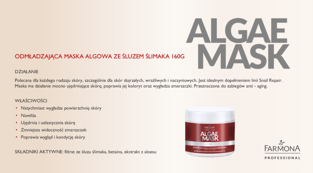 Maska algowa polecana do każdego rodzaju skóry, szczególnie dojrzałej, wrażliwej i naczyniowej. Natychmiastowo wygładza, nawilża, ujędrnia i uelastycznia skórę. Dzięki zastosowaniu filtratu ze śluzem ślimaka zostaje zmniejszona widoczność zmarszczek oraz zostaje poprawiony wygląd i kondycja skóry.