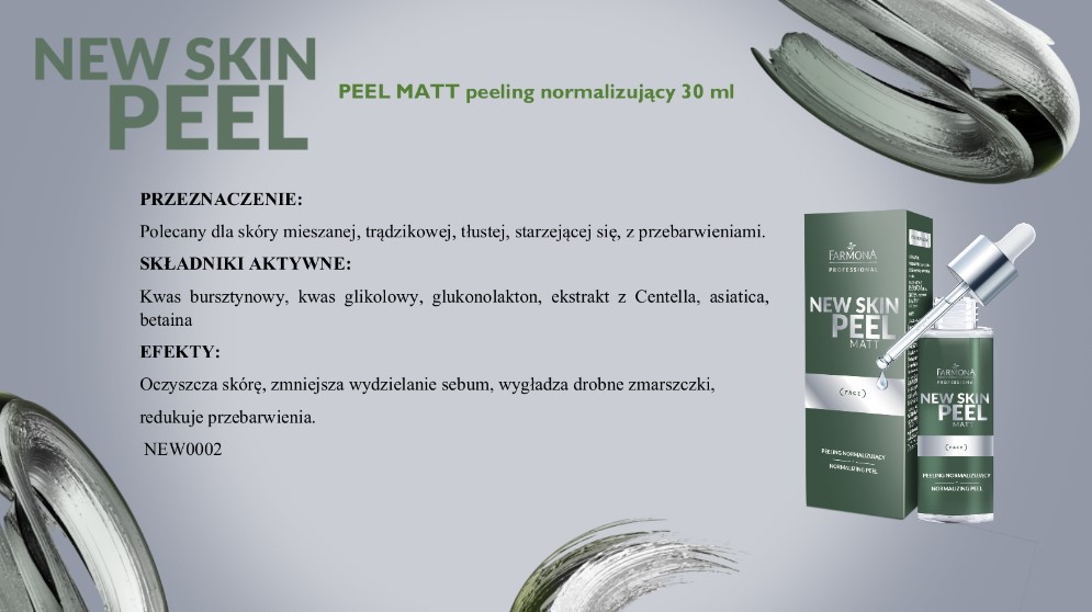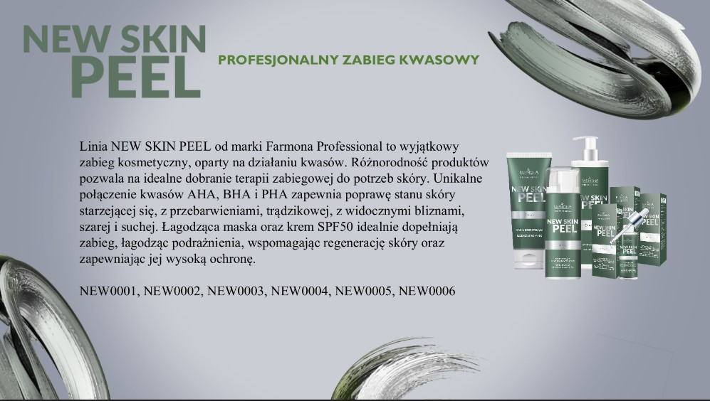 Linia NEW SKIN PEEL od marki Farmona Professional to wyjątkowy zabieg kosmetyczny, oparty na działaniu kwasów. Różnorodność produktów pozwala na idealne dobranie terapii zabiegowej do potrzeb skóry. Unikalne połączenie kwasów AHA, BHA i PHA zapewnia poprawę stanu skóry starzejącej się, z przebarwieniami, trądzikowej, z widocznymi bliznami, szarej i suchej. Łagodząca maska oraz krem SPF50 idealnie dopełniają zabieg, łagodząc podrażnienia, wspomagając regenerację skóry oraz zapewniając jej wysoką ochronę.