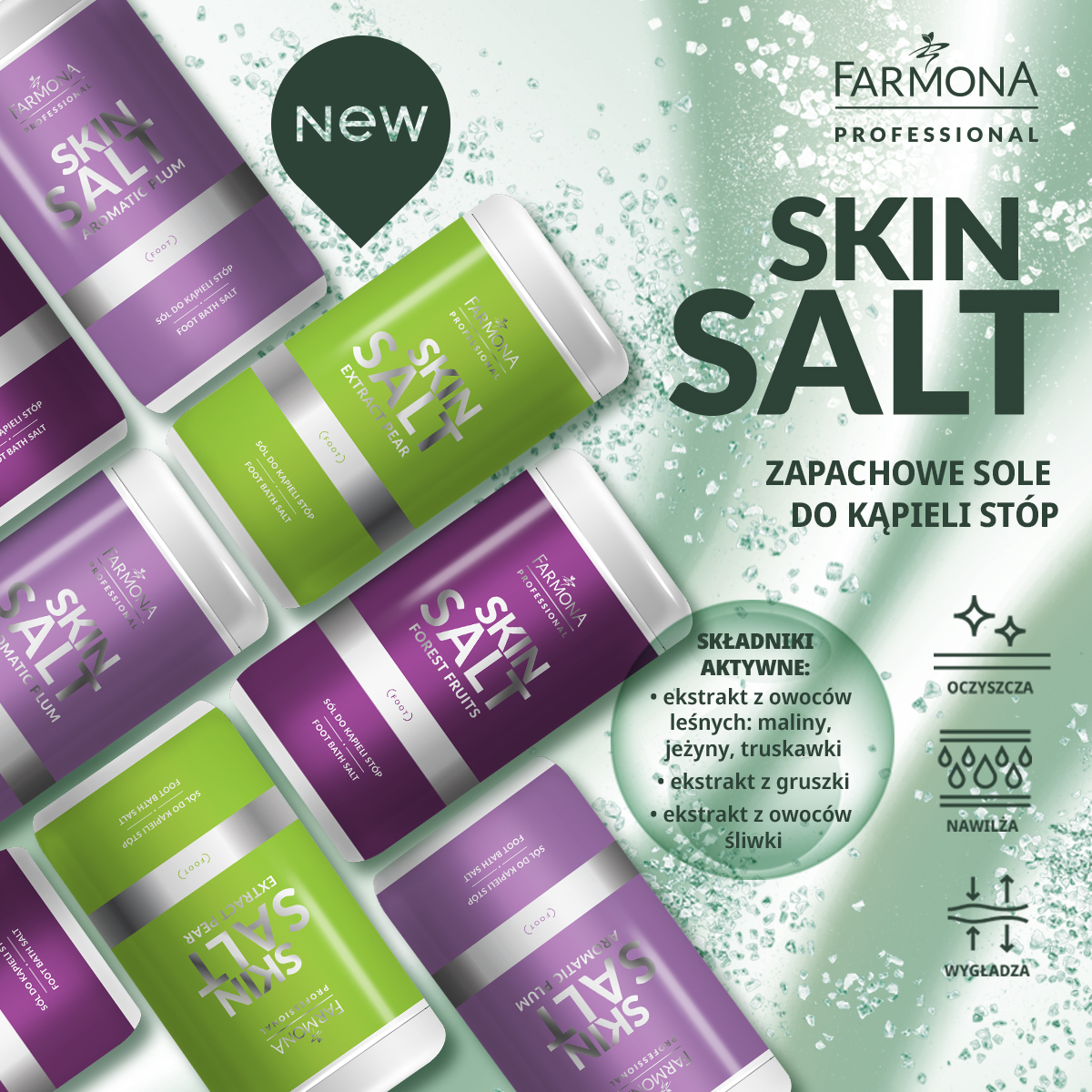 Skin Salt Sól do kąpieli stóp Forest Fruits 1400g – przeznaczona do kąpieli przed zabiegiem pedicure, szczególnie w przypadku bardzo suchej, szorstkiej i nadmiernie rogowaciejącej skóry stóp.