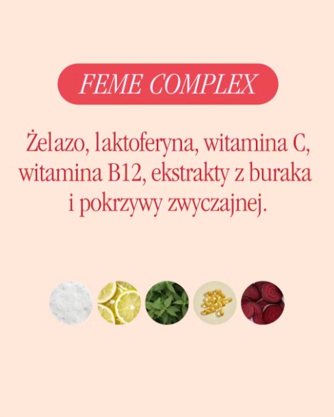 FeMe Complex to suplement diety wspierający produkcję czerwonych krwinek i hemoglobiny. Zawiera żelazo, witaminę C, kwas foliowy, B12 i cynk. Redukuje zmęczenie i zwiększa energię.