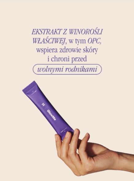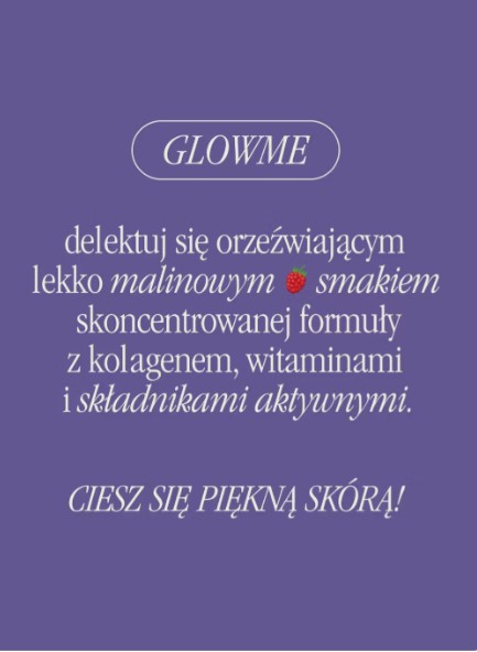 GlowMe (malina) to suplement diety w formie wygodnych saszetek, łączący hydrolizowany kolagen rybi, kwas hialuronowy, ekstrakt z pestek winogron (w tym OPC), witaminę C, witaminę A oraz witaminę E. Zawarte w produkcie składniki wspierają prawidłowe funkcjonowanie skóry, pomagają chronić komórki przed stresem oksydacyjnym oraz biorą udział w procesach ważnych dla utrzymania jej zdrowego wyglądu¹.