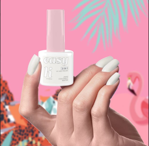 KROK 2: Pomaluj paznokcie cienką warstwą lakieru hi hybrid easy 3w1, pomaluj także brzeg paznokcia i utwardź w lampie (60s w lampie o mocy 24W).