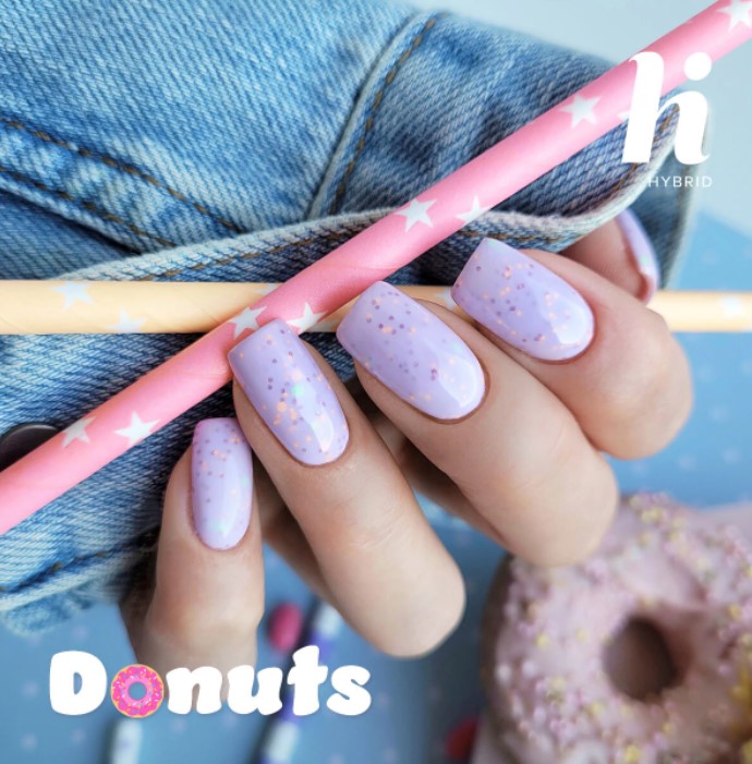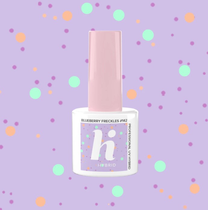 HI HYBRID #142 BLUEBERRY FRECKLES 5ml DONUTS to mleczno-jagodowy koktajlu. Delikatnie rozbielony fiolet #142 Blueberry Freckles z pomarańczowymi, limonkowymi i fioletowymi piegami to idealny pomysł na wiosenny jak i wakacyjny manicure. Wygląda pysznie na całej płytce paznokcia, dodaje też charakteru wykorzystany jako element zdobień. Pychota!