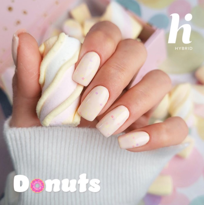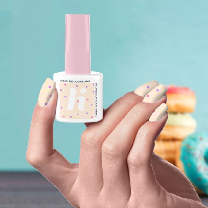 HI HYBRID #143 PEACH PIE COOKIE 5ml DONUTS to brzoskwiniowy kolor #143 Peach Pie Cookie z fioletowo-różową drobinką i delikatną neonowo-żółtą posypką i stwórz stylizację, że palce lizać 😉 Apetyczny niczym brzoskwiniowe ciasteczko odcień to delikatna, uniwersalna propozycja z nutą słodyczy
