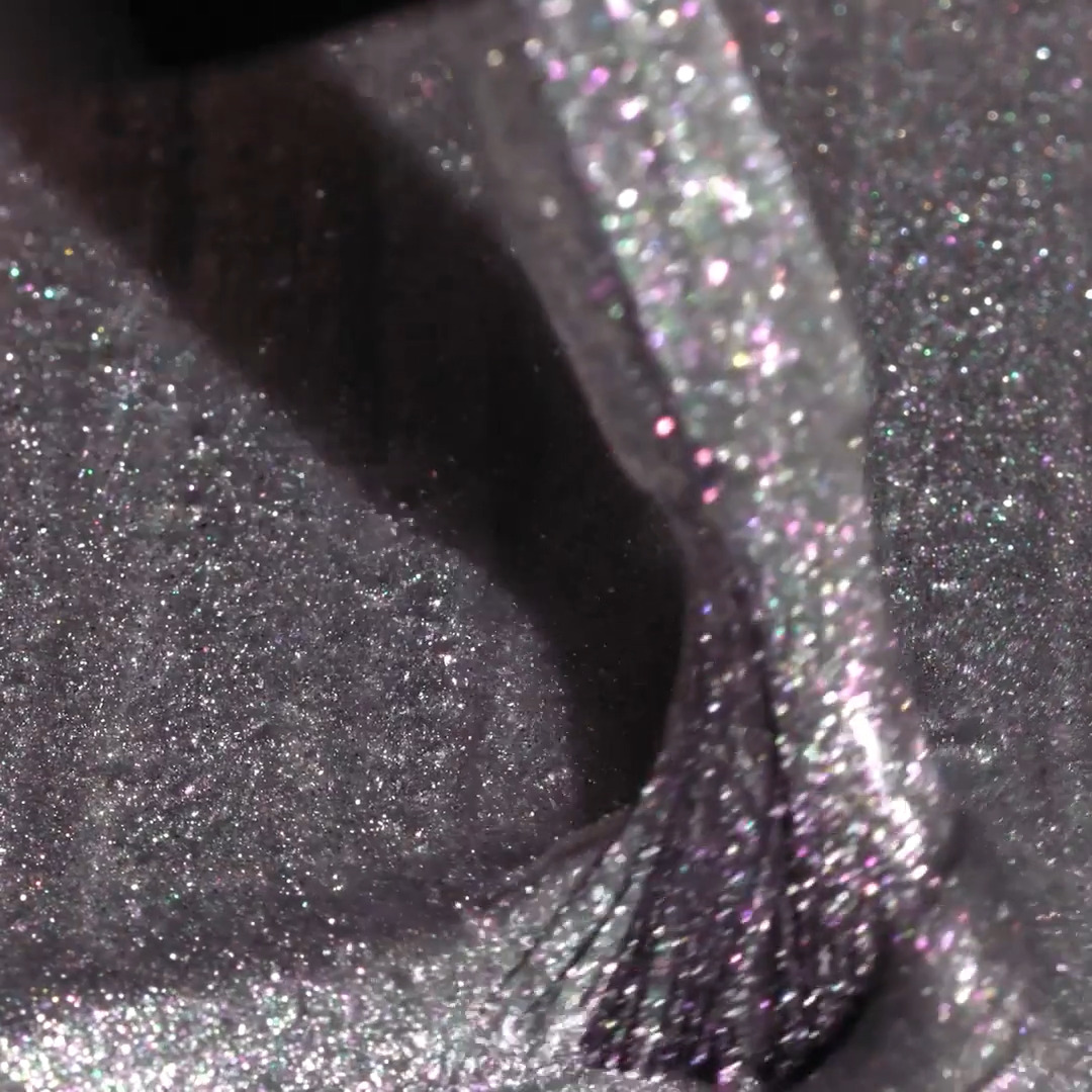Srebrny, półtransparentny lakier z magnetyczną drobiną z różową poświatą.