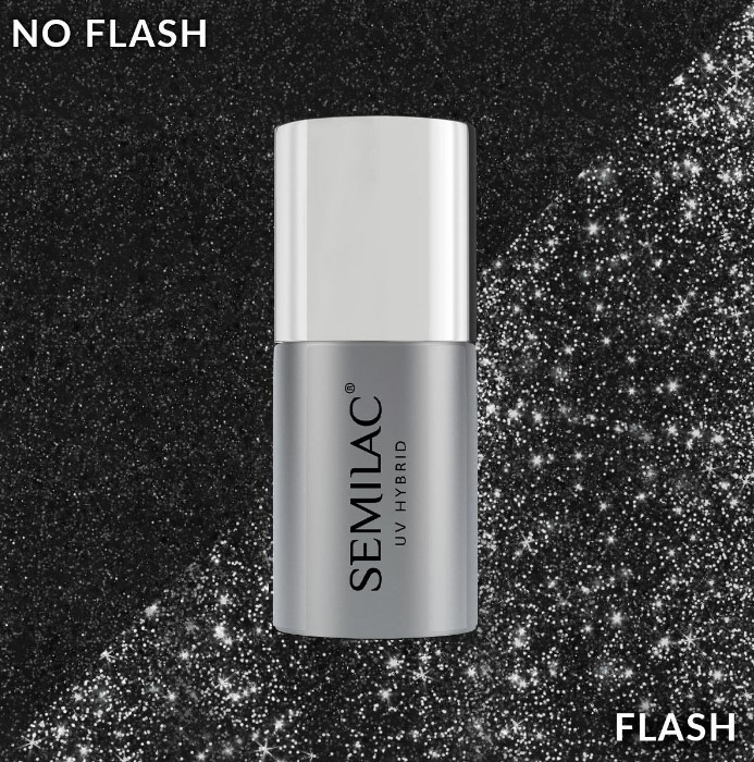 SEMILAC TOP NO WIPE 7ml T21 FLASH ON to błyszczący top hybrydowy w formule no wipe, czyli niewymagający przemywania, w którym zatopiliśmy mnóstwo mieniących się srebrnych drobinek, które przy odpowiednim świetle lampy błyskowej migoczą niewiarygodnym blaskiem- efekt flash. Srebrne, mieniące się drobiny, które pod wpływem światła migoczą niewiarygodnym blaskiem. Top można nałożyć zarówno na lakiery hybrydowe jak i żele. Jego intensywność zależy od natężenia i kąta padania światła.