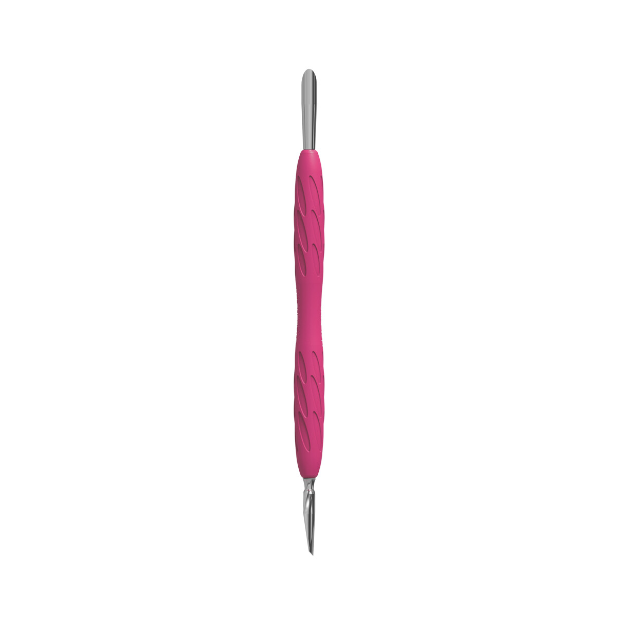 Silikonowy uchwyt pomaga równomiernie rozłożyć nacisk na powierzchnię palca, zapobiegając uszkodzeniom skóry i dyskomfortowi. Jest łatwiejszy w czyszczeniu i dezynfekcji, co sprawia, że użytkowanie pchacza w gabinetach kosmetycznych jest maksymalnie higieniczne. Różowy uchwyt umożliwia wygodne trzymanie narzędzia bez poślizgu, co pozwala pracować bez obciążania dłoni.