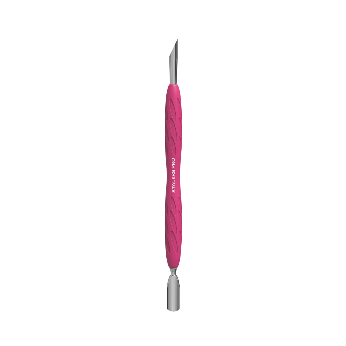 Szpatułka do manicure STALEKS PRO UNIQ 10 TYPE 2 PQ-10/2 przeznaczona jest do manicure i pedicure. Narzędzie posiadające dwie części robocze – zaokrąglony wąski popychacz na jednym końcu i skośny na drugim. Wąska część nadaje się do obróbki skórek przy pracy z wąską i średnią płytką paznokcia, a skośny popychacz służy do uniesienia i przesunięcia mocno sklejonego szorstkiego naskórka, oczyszczenia wolnego brzegu paznokcia, usunięcia zacieków żelu polski. Kształtem ten popychacz wygląda jak metalowy pomarańczowy patyczek.