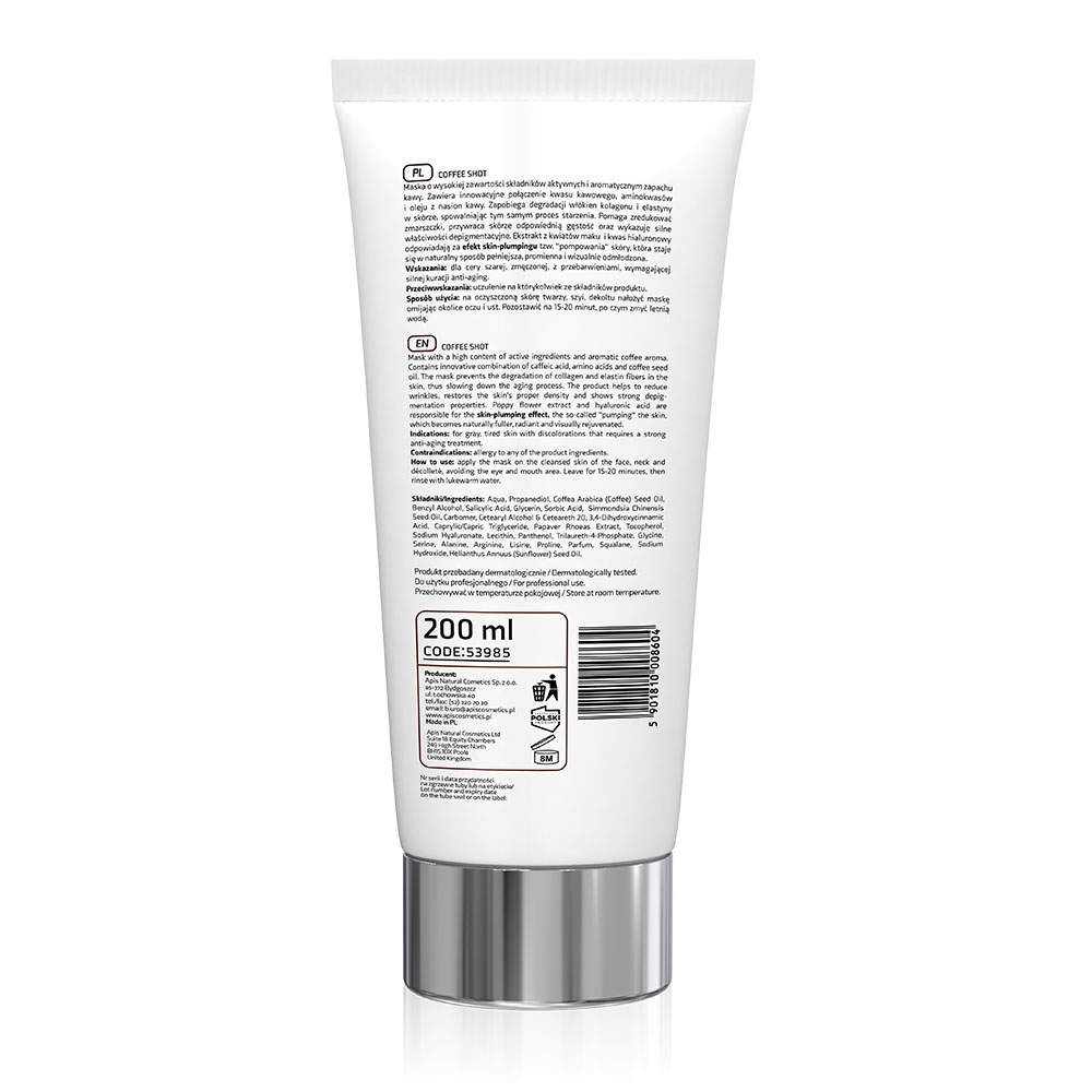 Maska o wysokiej zawartości składników aktywnych i aromatycznym zapachu kawy. Zawiera innowacyjne połączenie kwasu kawowego, aminokwasów i oleju z nasion kawy. Zapobiega degradacji włókien kolagenu i elastyny w skórze, spowalniając tym samym proces starzenia. Pomaga zredukować zmarszczki, przywraca skórze odpowiednią gęstość oraz wykazuje silne właściwości depigmentacyjne. Ekstrakt z kwiatów maku i kwas hialuronowy odpowiadają za efekt skin-plumpingu tzw. “pompowania” skóry, która staje się w naturalny sposób pełniejsza, promienna i wizualnie odmłodzona.