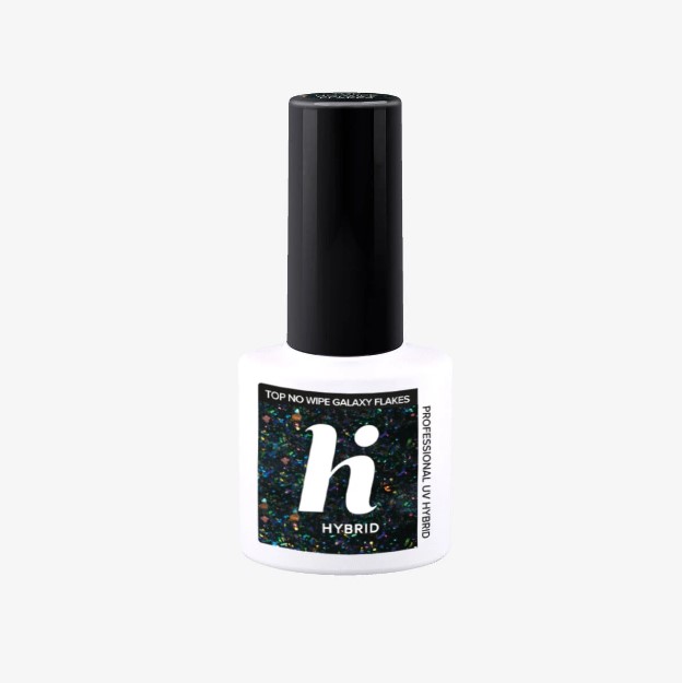 Galaktyczne niebo na Twoich paznokciach prosto i bez wysiłku? Wystarczy kilka chwil a Twój manicure będzie wystrzelony w kosmos! Wybierz Top No Wipe Galaxy Flakes i aplikuj na dowolnie wybrany kolor hi hybrid. Podziwiaj jak z każdym ruchem dłoni różnokolorowe płatki mienią się tysiącem barw. Wypróbuj top na ciemnych odcieniach jak czerń czy kobalt i stwórz prawdziwie kosmiczny krajobraz. Jesteś fanką subtelniejszego błysku? Użyj topu do wykończenia kremowych i pastelowych stylizacji i ciesz się olśniewającym manicure.