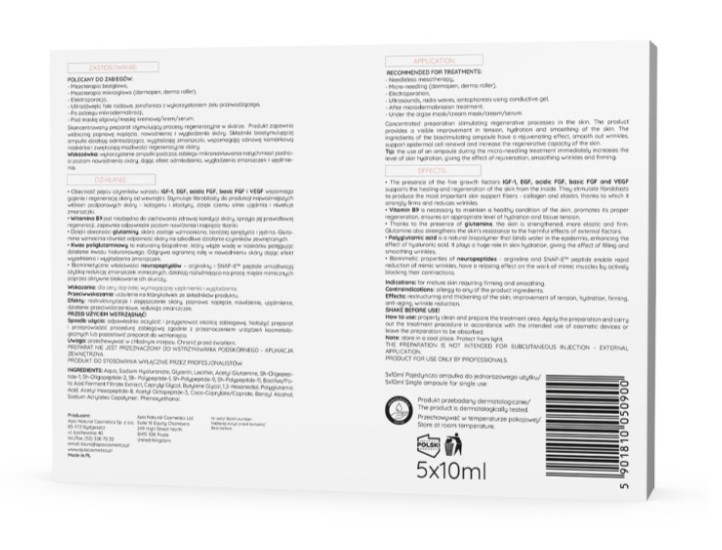 • Obecność pięciu czynników wzrostu IGF-1, EGF, acidic FGF, basic FGF i VEGF wspomaga gojenie i regenerację skóry od wewnątrz. Stymuluje fibroblasty do produkcji najważniejszych włókien podporowych skóry – kolagenu i elastyny, dzięki czemu silnie ujędrnia i niweluje zmarszczki.
