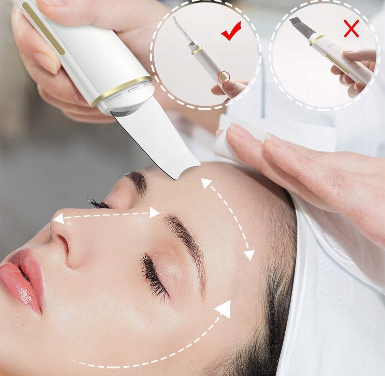 Zabieg: Przesuwaj szpatułkę wzdłuż nawilżonej części twarzy, trzymając urządzenie pod kątem około 45 stopni. Upewnij się, że skóra pozostaje dobrze nawilżona przez cały czas trwania zabiegu.