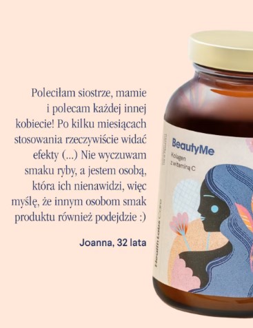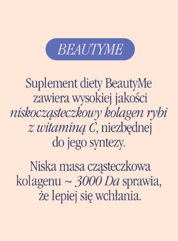 Suplement diety BeautyMe przeznaczony jest dla osób dorosłych, które chcą uzupełniać dietę w kolagen rybi oraz witaminę C, szczególnie w okresie, gdy naturalna synteza kolagenu w organizmie ulega zmniejszeniu.