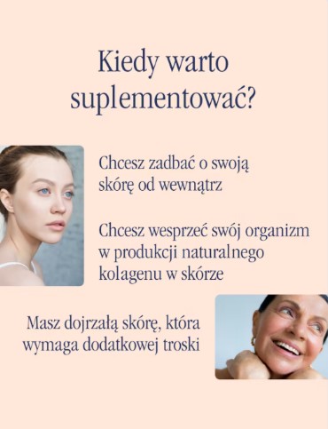Po 25. roku życia naturalna synteza kolagenu w organizmie stopniowo się zmniejsza. Z tego względu coraz więcej osób decyduje się na regularną suplementację diety w kolagen oraz witaminę C – składnik, który wspiera prawidłową produkcję kolagenu dla prawidłowego funkcjonowania skóry¹.