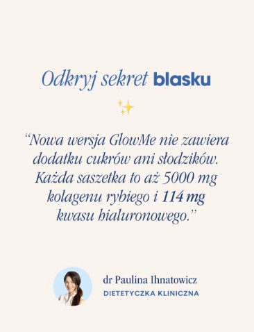 GlowMe to suplement diety w formie saszetek on-the-go, stworzony z myślą o codziennej pielęgnacji skóry od wewnątrz. Połączenie kolagenu rybiego, kwasu hialuronowego, witamin A, C, E oraz ekstraktu z nasion winorośli właściwej wspiera naturalną kondycję skóry, jej nawilżenie, jędrność i zdrowy wygląd¹. Formuła bez dodatku cukrów i substancji słodzików to wygodny i przyjazny dla organizmu sposób na codzienną suplementację.