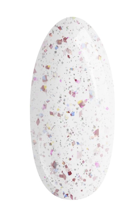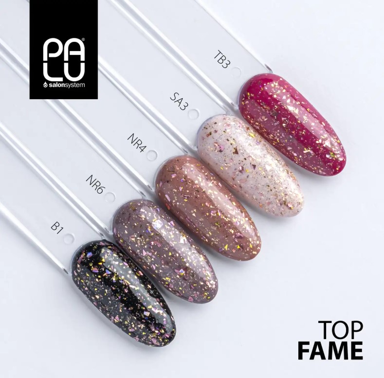 Top Fame No Wipe marki Palu to profesjonalny, bezwarstwowy top hybrydowy z dodatkiem efektownej, ciętej folii w odcieniach złota i różowego złota. Transparentna baza podkreśla kolor lakieru, a zatopione drobinki odbijają światło, tworząc biżuteryjny, luksusowy efekt niczym różane płatki musujące w świetle szampana.